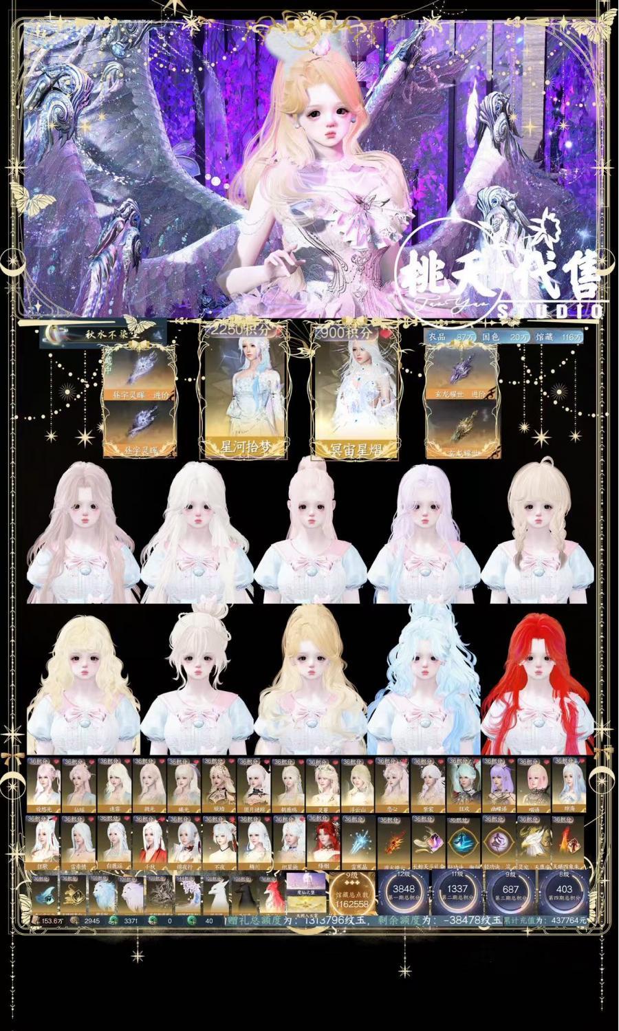 【Taoyao2506】⭐捡漏225000⭐【飞花/玄喵/万象三合一】飘渺+小白龙+六翼大翅膀+新顶奢蝴蝶+应龙+天使+琉晶+顶奢神树+新赛年橙武+42自染+38颗未用天赏+18礼盒(可换36丝/18清露)+1可交易玉山绻+1可交易银月冕+5000w铜币+1w纹玉(可无痛新祥瑞,做完馆藏还可领下一档20礼盒奖励无痛第七套)400w赠礼额度+仙逆/魔仙堡/斩神联动主页+斩神群龙+十大国色/衣品/馆藏【Taoyao2506】缥缈云流鹤上仙丨铸星幻龙丨应龙霆霓丨琉晶昭明丨冥宙曜火丨露桃逢仙坞丨新赛年橙武丨12代橙武丨九尾狐丨42自染丨477天赏丨九灵✅价格:2区服类型: 逆水寒手游 /选择大区 /逍遥游 /飞花逐月 |